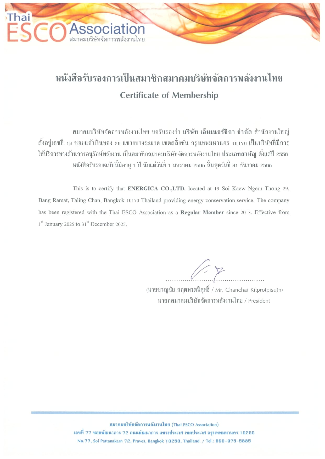 Energica Co., Ltd. was established in 2005, and our business includes energy services, renewable energy, environmental management, and indoor air quality. Energica was registered as an Energy Service Company (ESCO) at the Institute of Energy for the Federation of Thai Industries and has become a member of the Thai Energy Service Company Association (General Type). Energica was also registered as a company for energy consulting with the Ministry of Finance. Based on the current situation, Energica focuses on providing energy and environmental services to create a low-carbon society in both the building and industrial sectors. The policies of Energica have been set up in accordance with the Carbon Neutrality in 2050 and Net Zero in 2065 of Thailand and with a modern business framework realizing responsibilities for the environment, society, and governance.