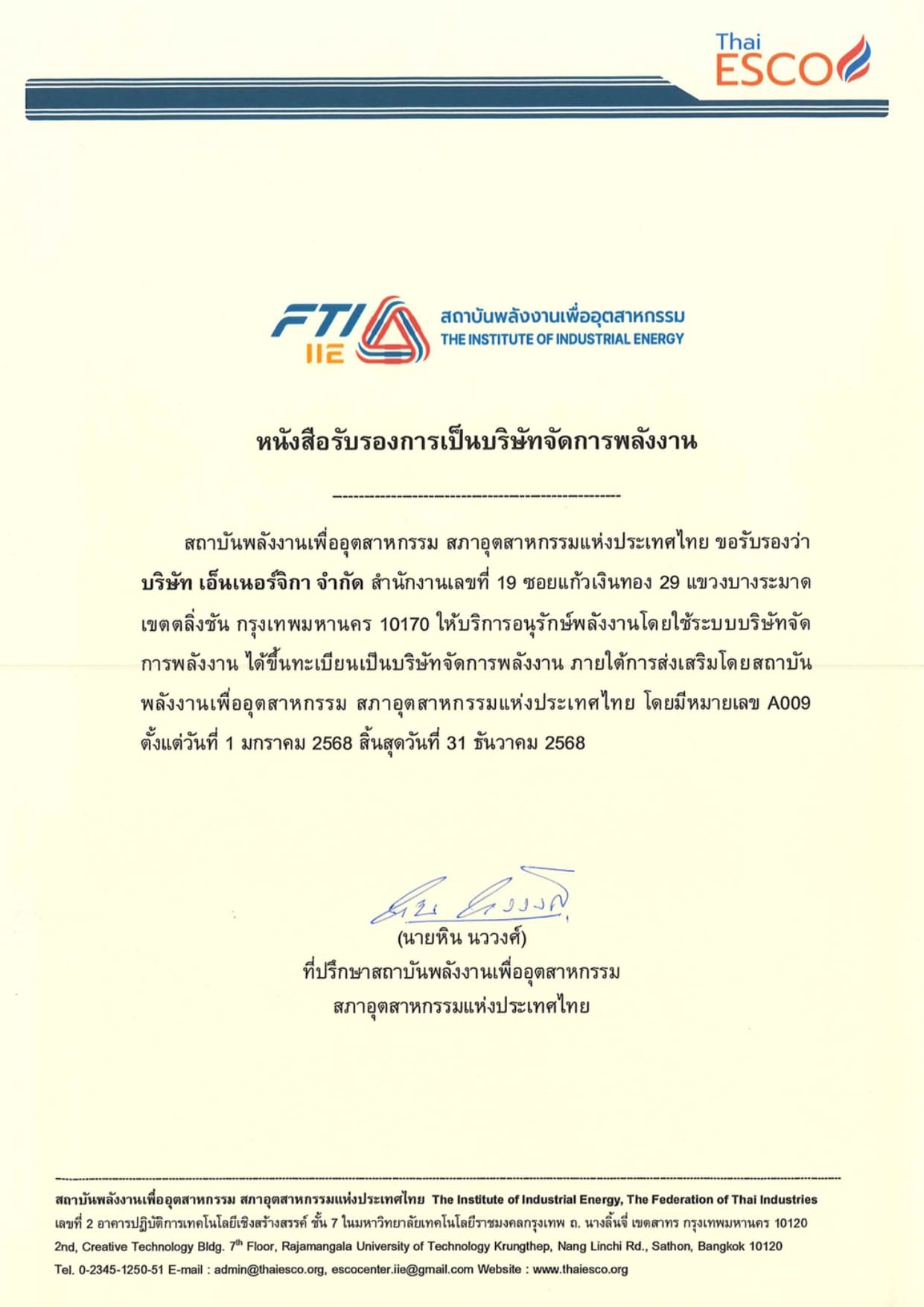บริษัท เอ็นเนอร์จิกา จำกัด ก่อตั้งขึ้นเมื่อปี พ.ศ.2548 โดยดำเนินธุรกิจด้าน การอนุรักษ์พลังงาน, พลังงานทดแทน, การจัดการสิ่งแวดล้อมและคุณภาพอากาศในอาคาร ได้จดทะเบียนเป็นบริษัทจัดการพลังงาน (ESCO) ที่สถาบันพลังงานเพื่ออุตสาหกรรมและเป็นสมาชิกสมาคมบริษัทจัดการพลังงานไทย ประเภทสามัญ ตลอดจนได้ขึ้นทะเบียนเป็นบริษัทที่ปรึกษาด้านพลังงานกับกระทรวงการคลัง จากสถานการณ์ปัจจุบัน ทางบริษัท เอ็นเนอร์จิกา จำกัด ได้มุ่งเน้นการให้บริการด้านพลังงานและสิ่งแวดล้อม เพื่อสร้างสังคมคาร์บอนต่ำ เข้ากับนโยบายภาคอาคารและอุตสาหกรรม ตามเป้าหมาย Carbon Neutrality ในปี คศ.2050 และ Net Zero ในปี คศ.2065 ของประเทศไทย และสอดคล้องกับธุรกิจยุคใหม่ที่มีกรอบการดำเนินธุรกิจที่คำนึงถึงสิ่งแวดล้อม สังคม และธรรมาธิบาล (Environmental Social and corporate governance)